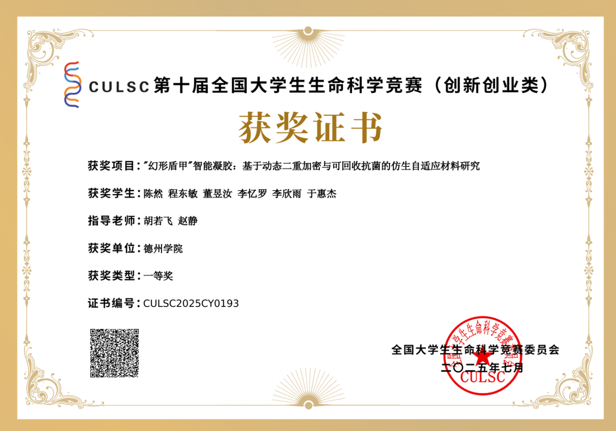 近日,第十届全国大学生生命科学竞赛国赛决赛分别在甘肃理工大学和烟台大学举办,亚博官网取得国家级一等奖1项,二等奖7项,三等奖11项的好成绩,其中赵静老师和胡若飞老师指导的项目《“幻形盾甲”智能凝胶:基于动态二重加密与可回收抗菌的仿生自适应材料研究》荣获创新创业类国家级一等奖,这是亚博官网在该项赛事获得的最好成绩,取得历史突破。同时亚博取款极速到账荣获优秀组织奖,生命科学学院张天宇老师荣获优秀管理员称号。