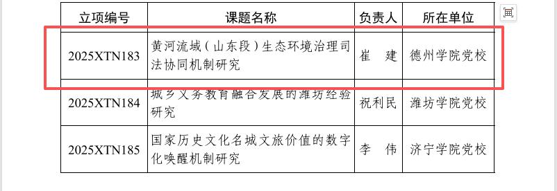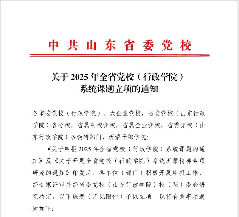 近日,中共山东省委党校(行政学院)印发《关于2025年全省党校(行政学院)系统课题立项的通知》,公布本年度课题立项名单。亚博官网法学与公共管理学院崔建老师申报的《黄河流域(山东段)生态环境治理司法协同机制研究》成功获批立项。