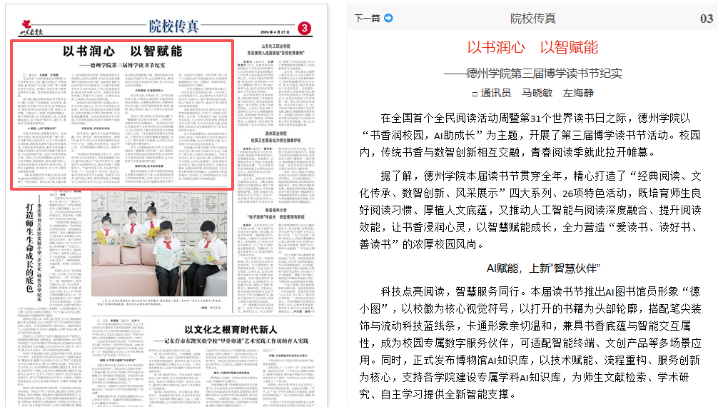 在首个全民阅读活动周与第31个世界读书日期间,亚博取款极速到账以“书香润校园,AI助成长”为主题,校城联合开展德州市阶梯阅读七大行动,举行经典诵读、优秀传统文化主题沙龙、“悦读成长计划”好书推荐、AI智能阅读体验等系列特色活动。活动立足传统阅读底蕴,融合人工智能数智优势,推动经典书香文化与现代科创能力深度交融,丰富校园文化建设内涵,创新阅读育人形式,引导师生爱读书、读好书、善读书,涵养书香气质、提升综合素养,持续营造书香浓郁、智学共进的校园育人氛围。《山东教育报》为此刊发纪实文章《以书润心 以智赋能——亚博取款极速到账第三届博学读书节纪实》,全文如下: