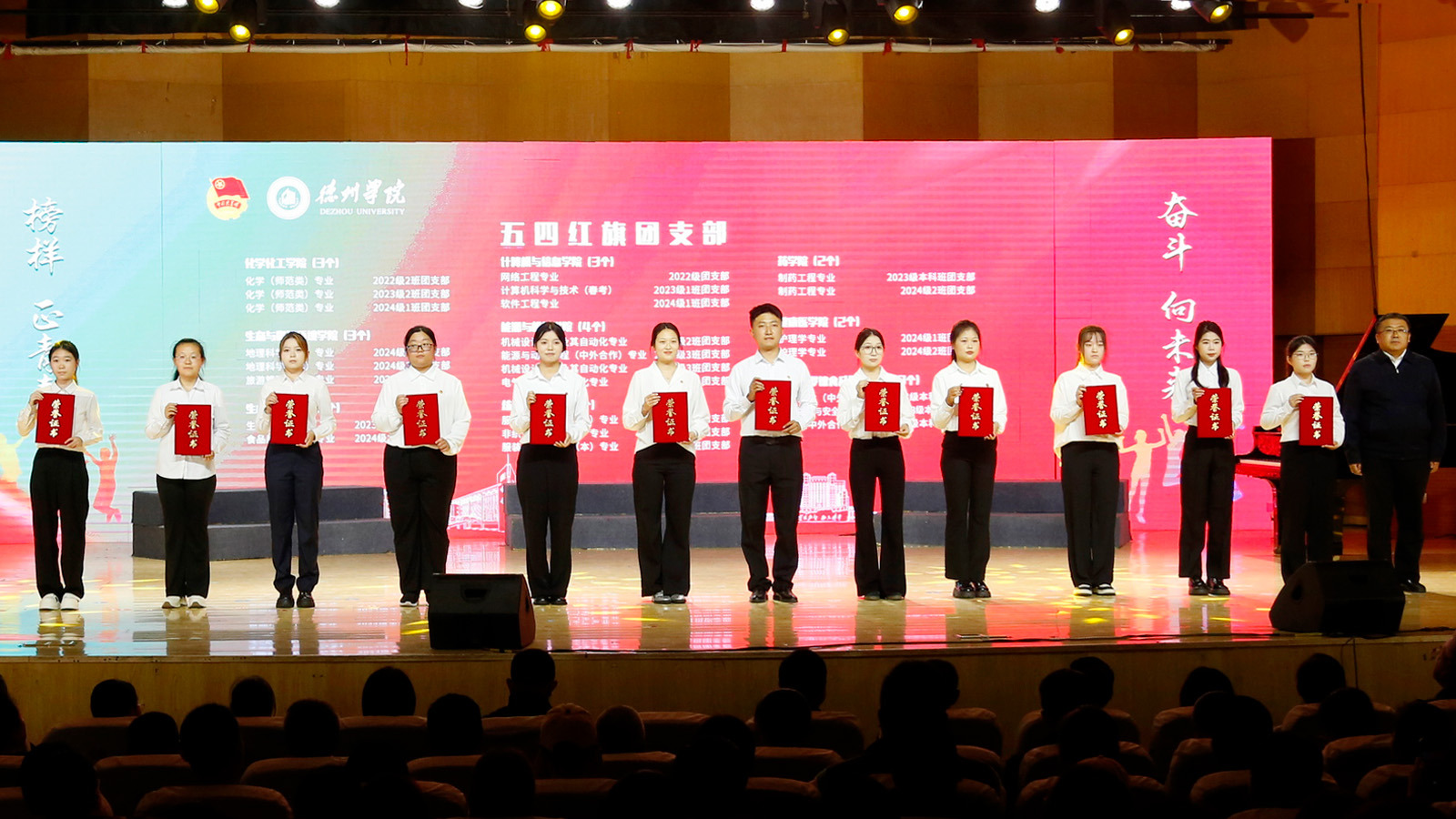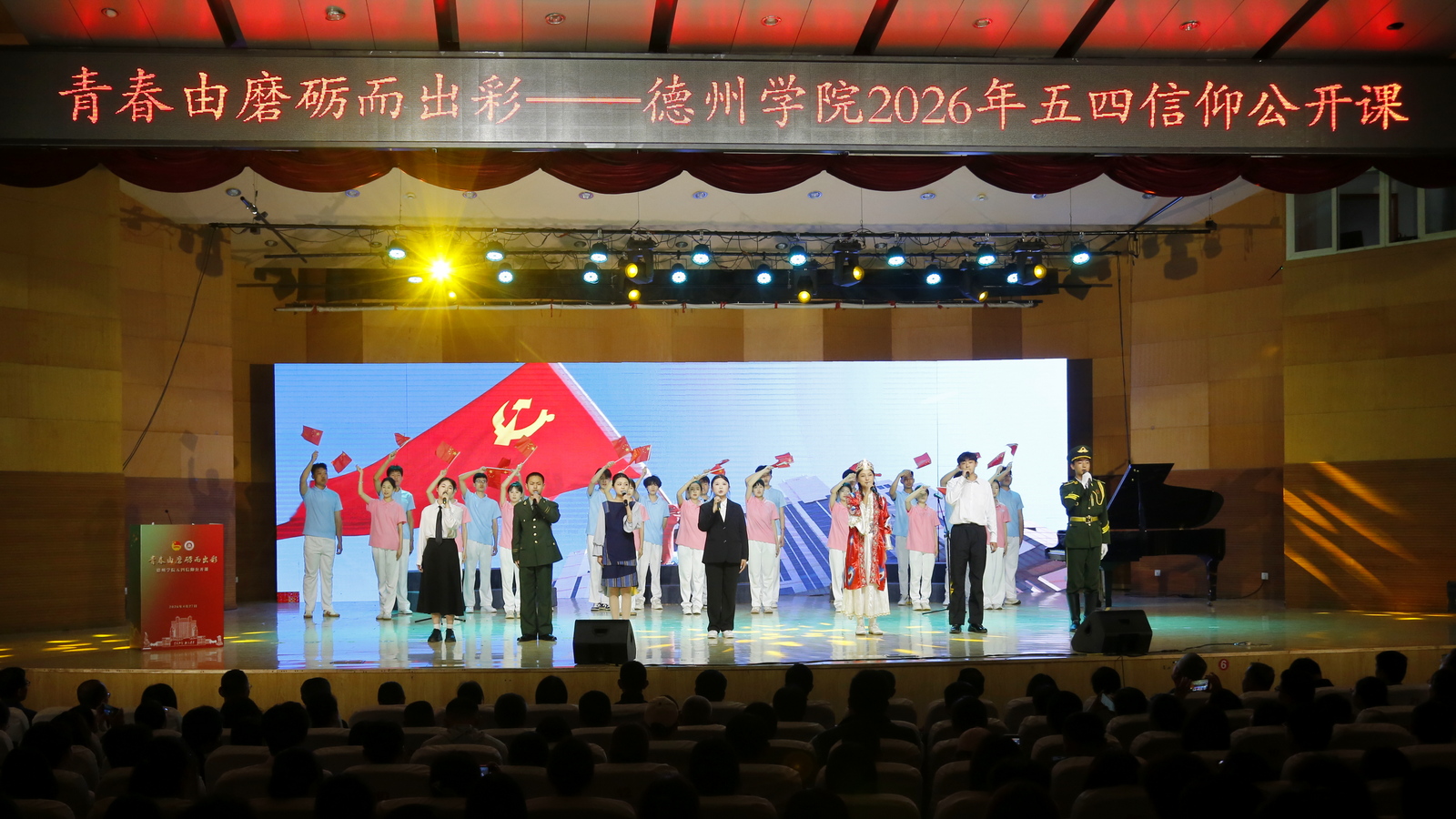 与会人员还共同观看了沉浸式表演:《强国一代有我在》《磨砺·出彩:我们的青春答卷》和情景剧《信仰的力量》。节目以德院青年同唱一首歌、青春汇报、跨越时空的对话等形式生动展现了新时代德院青年“青春由磨砺而出彩”的坚定信仰与蓬勃朝气。