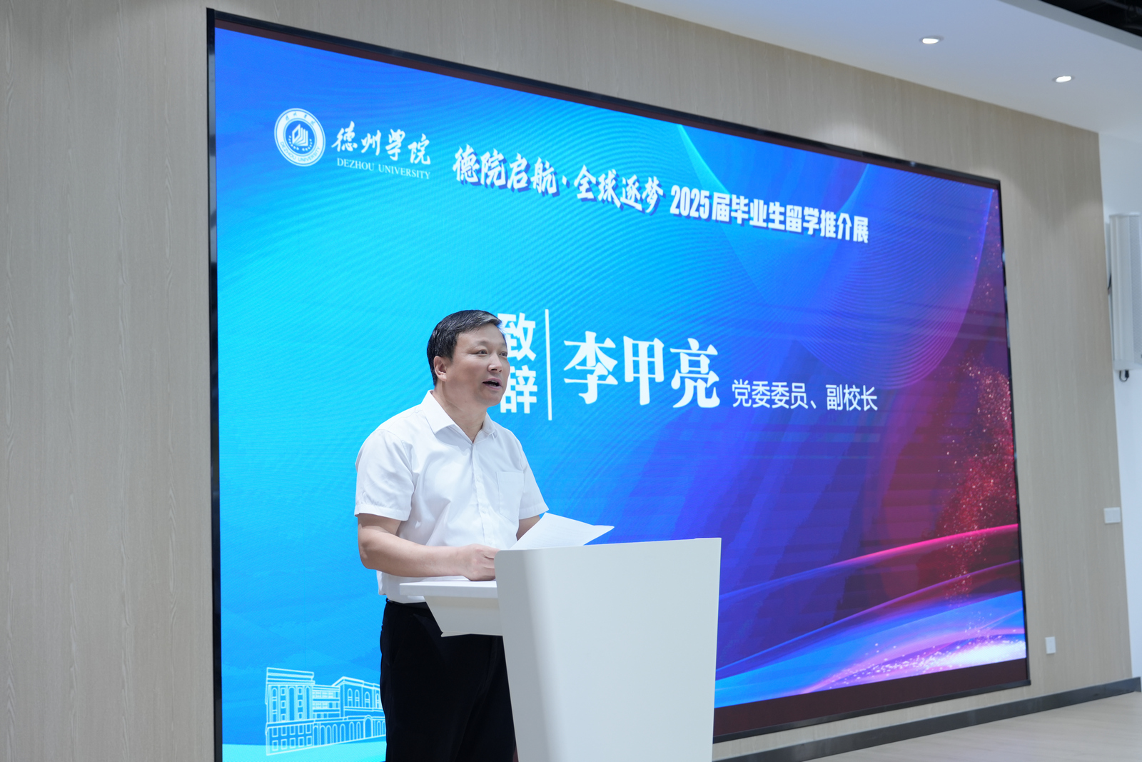 为深入贯彻落实教育部关于高校毕业生就业工作的决策部署,拓宽毕业生海外深造与就业渠道,6月4日,学校“德院启航·全球逐梦”2025届毕业生留学推介展在大学生就业创业赋能中心举办。党委委员、副校长李甲亮出席活动并致辞。