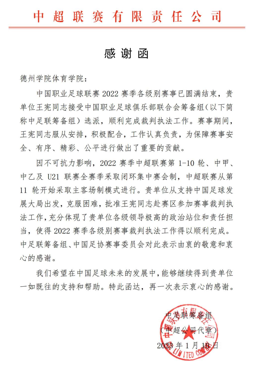 感谢信提到,因不可抗力影响,2022 赛季中超联赛第 1-10 轮、中甲、中乙及 U21 联赛全赛季釆取闭环集中赛会制,中超联赛从第11 轮开始采取主客场制模式进行。贵单位从支持中国足球发展大局出发,克服困难,批准王宪同志赴赛区参加赛事裁判执法工作,充分体现了贵单位各级领导极高的政治站位和责任担当,使得 2022 赛季各级别赛事裁判执法工作得以顺利完成。中足联筹备组、中国足协赛事委员会对此表示由衷的敬意和衷心的感谢