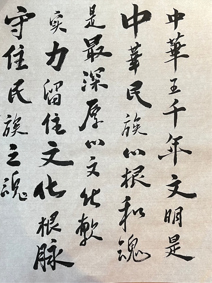 活动中,同学们学金句、读金句、悟金句,用饱蘸真情的笔墨,精湛的笔法,各具特色的书体,选取党的二十大报告中的金句,创作成书法作品,通过一撇一捺书写盛世芳华,一笔一划传达金句内涵,展现出新时代青年关心国家大事,在新征程中踔厉奋发,勇毅前行的决心。