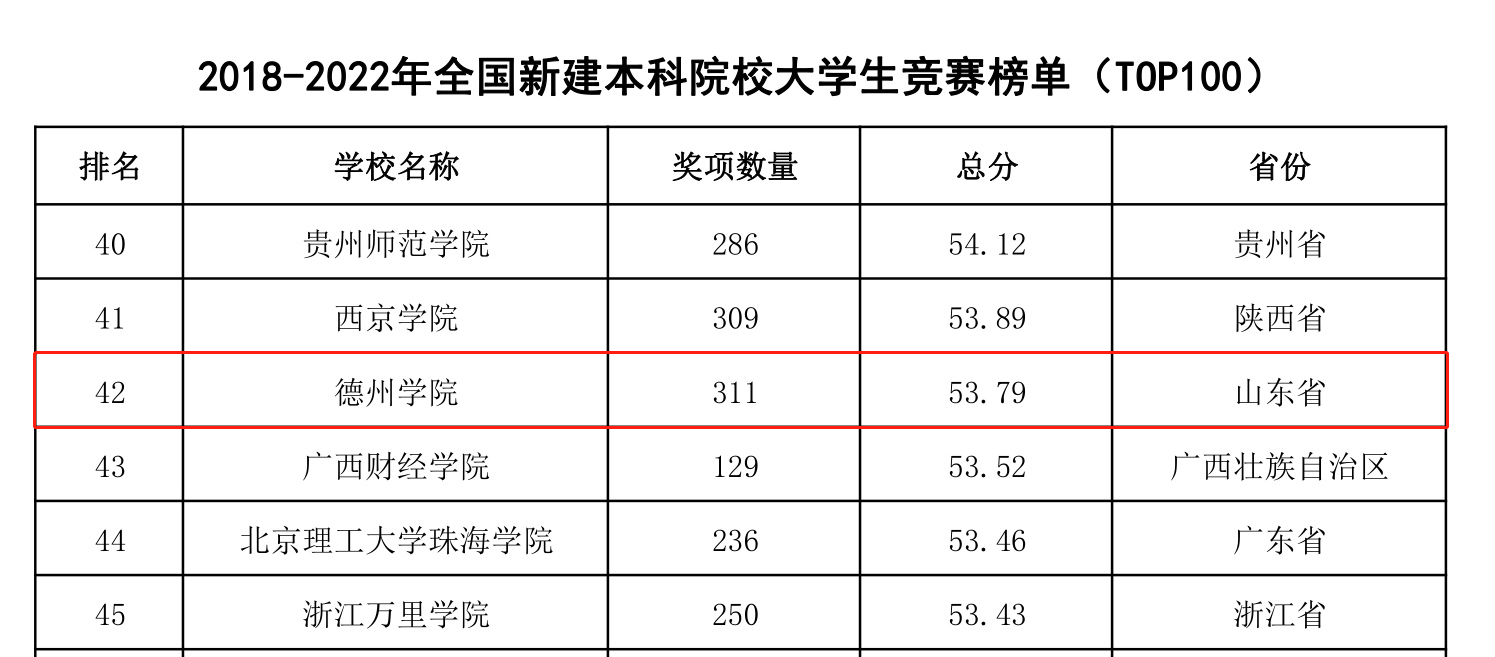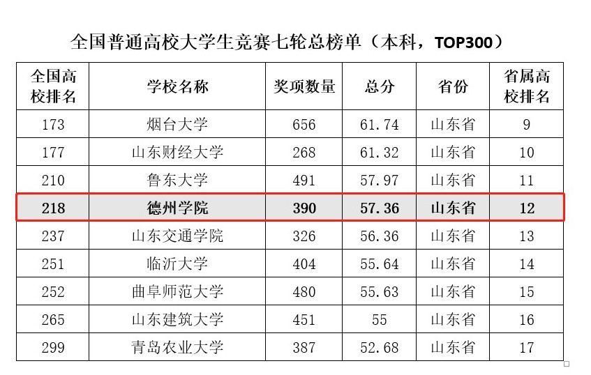 近日,中国高等教育学会发布了2022全国普通高校大学生竞赛排行榜,亚博官网获奖数量390项,相比2021年增加了104项,在《全国普通高校大学生竞赛七轮总榜单》(本科,TOP300)中,亚博官网位列第218位,名次位列山东省省属高校第12名;在《2018-2022年全国新建本科院校大学生竞赛榜单》(TOP100)中位列第42位,比去年提升3位。充分展示了亚博官网在本科教育教学和创新人才培养方面取得的成果。