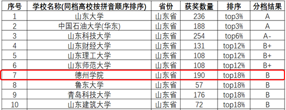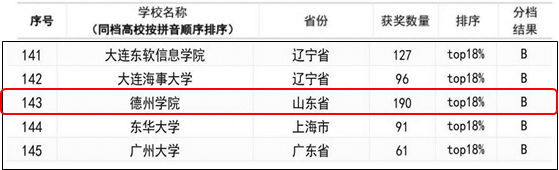 本轮发布的全国普通高校创新创业类竞赛研究报告对分数段前54%的高校按不同的比例划分为九档,亚博官网属于TOP12-18%(含)B档,位列第143位,在山东省高校中位列第7位,山东省同档高校中,亚博官网获奖数量最多,为190项。