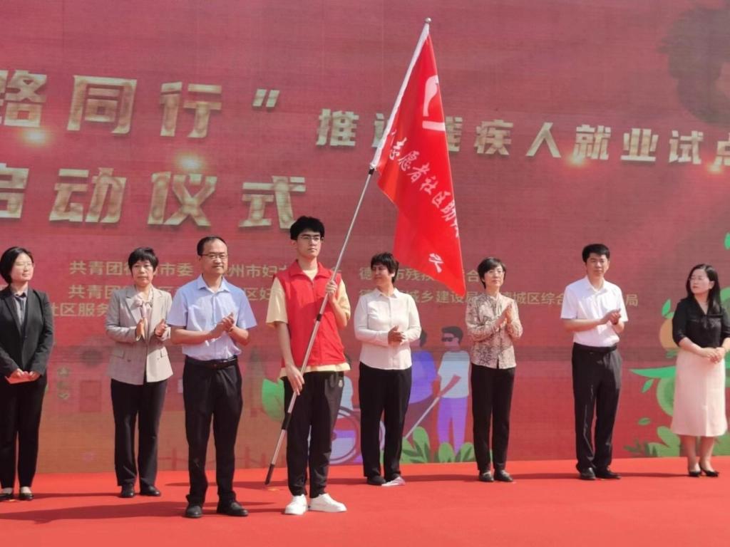 5月16日上午,由共青团德州市委、德州市精神文明建设委员会、德州市残联、德州市总工会、德州市妇联联合举办的德州市青年志愿者社区助残服务队授旗仪式在德城区嘉诚景园举行。亚博官网青年志愿者联合会服务队参加授旗仪式,并接受青年社区助残服务队队旗。