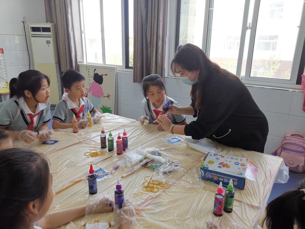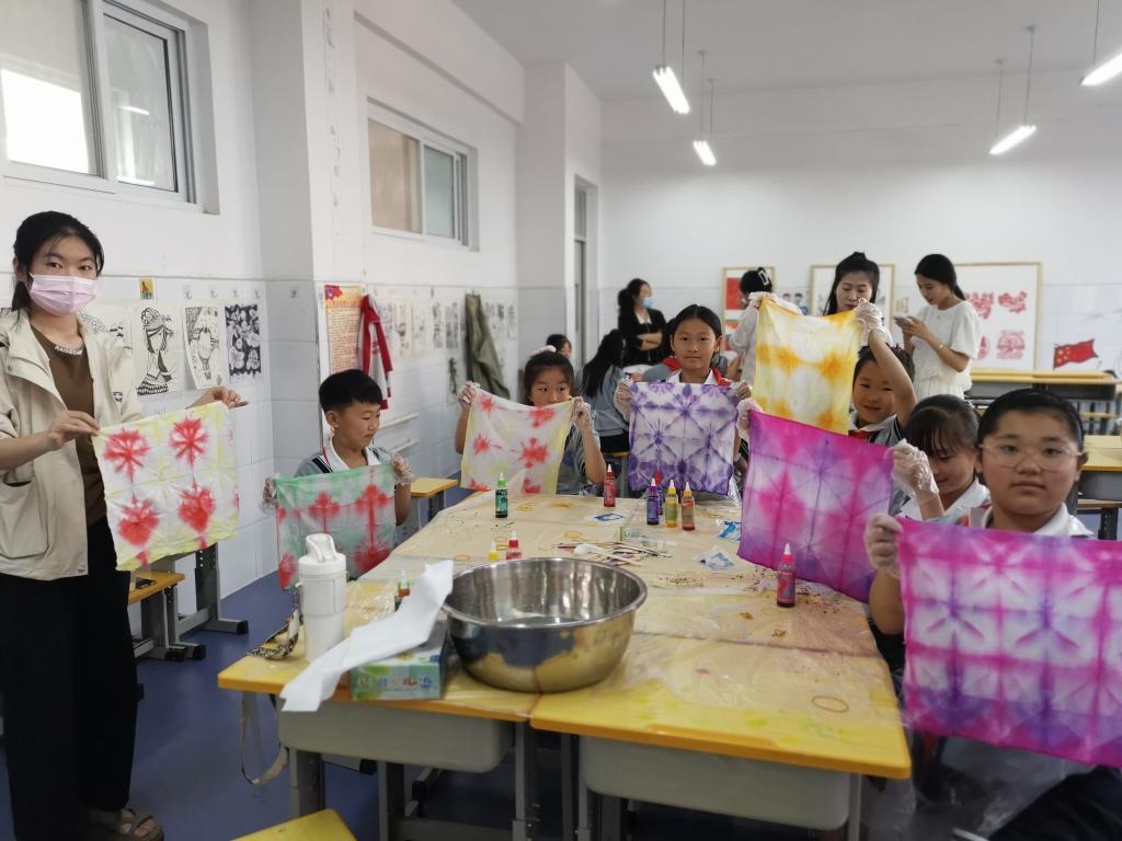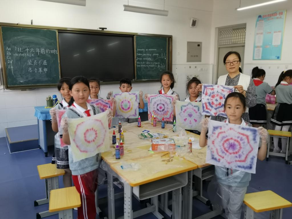 课程主要围绕扎染艺术赏析和中国扎染非物质文化遗产传承的价值和意义展开,以此提升学生的审美水平。课上,老师们带领学生动手制作扎染作品,体验扎染的工艺过程,鼓励学生要充分发挥想象力和创新力,大胆尝试,勇于实践,同时让学生们感受到中国传统手工扎染的艺术魅力。