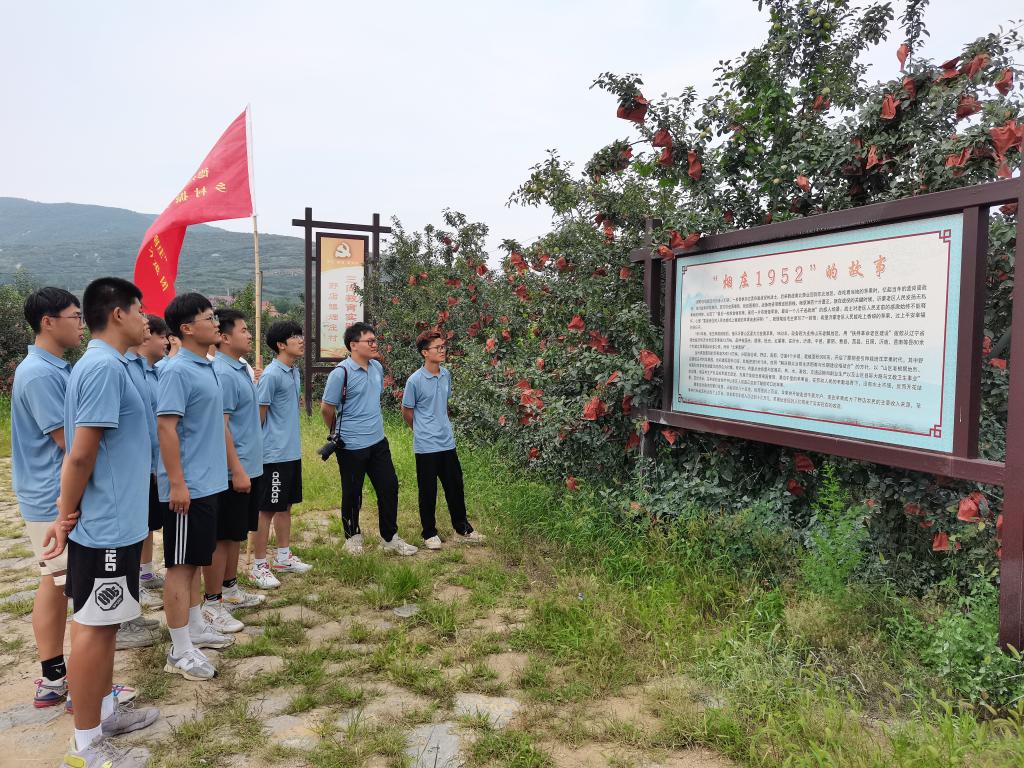 实践团成员们来到烟庄实地参观了烟庄苹果古树观光园,这片苹果园是根正苗红的沂蒙山苹果的源头,是毛主席指示“沂蒙山区要大力发展苹果”后,1952年党中央从辽宁调来苹果苗发展而来,时称“北果南移”,这正是“烟庄1952”苹果的起源。留存至今的66棵老果树,见证了沂蒙山果业的富农之路。随着这批苗木繁衍发展,在省派第一书记协调推动下,烟庄村党支部领办合作社注册了“烟庄1952”沂蒙山果品商标。从当年的600株树苗到如今的3000亩果园,苹果树已经走进烟庄村的千家万户,苹果产业也成为了当地的支柱产业。团队成员走进果园,了解苹果产业的发展,感受革命老区的振兴蝶变。