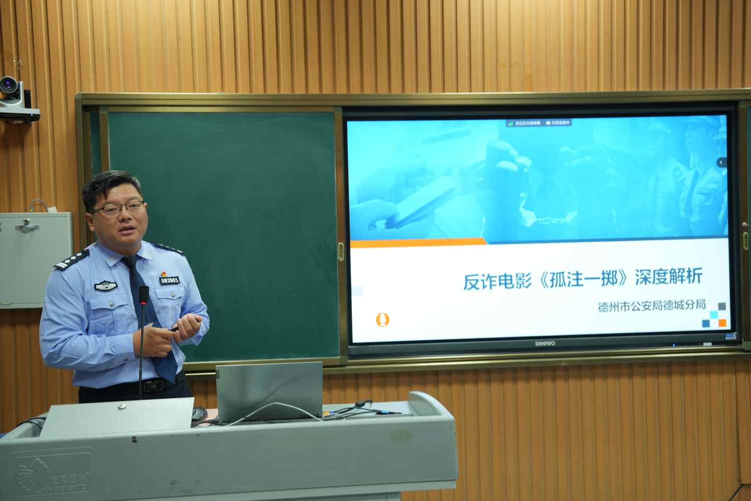 为进一步提高学生防范网络电信诈骗的安全意识和自我保护能力,结合2023年德州市“全民反诈在行动”集中宣传月活动,9月8日晚,邀请德州市公安局德城分局新型犯罪研究作战中心,二级警长娄斌警官为2023级新生做反诈宣传报告。