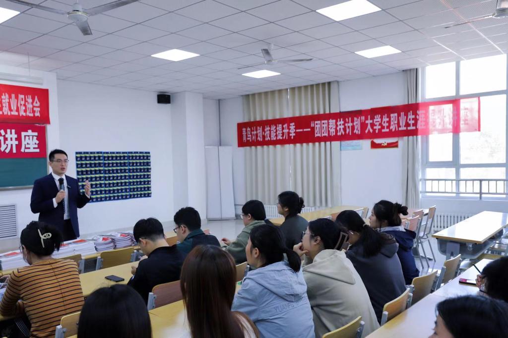 为助力大学生就业,帮助青年学生树立正确观念、提升就业创业技能,经济管理学院组织开展“逐梦金秋,职点未来”就业促进专题讲座。10月21日,邀请学院知名校友、职业生涯规划师王德滨一行来校进行“毕业生就业促进专题讲座”。此次专题讲座系学院“就业育人”项目的重要一环,也是“团团帮扶计划”系列活动。2024届毕业生共计200余人参加了此次专题讲座。