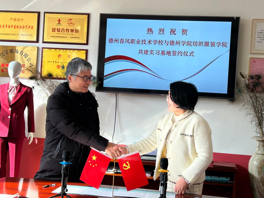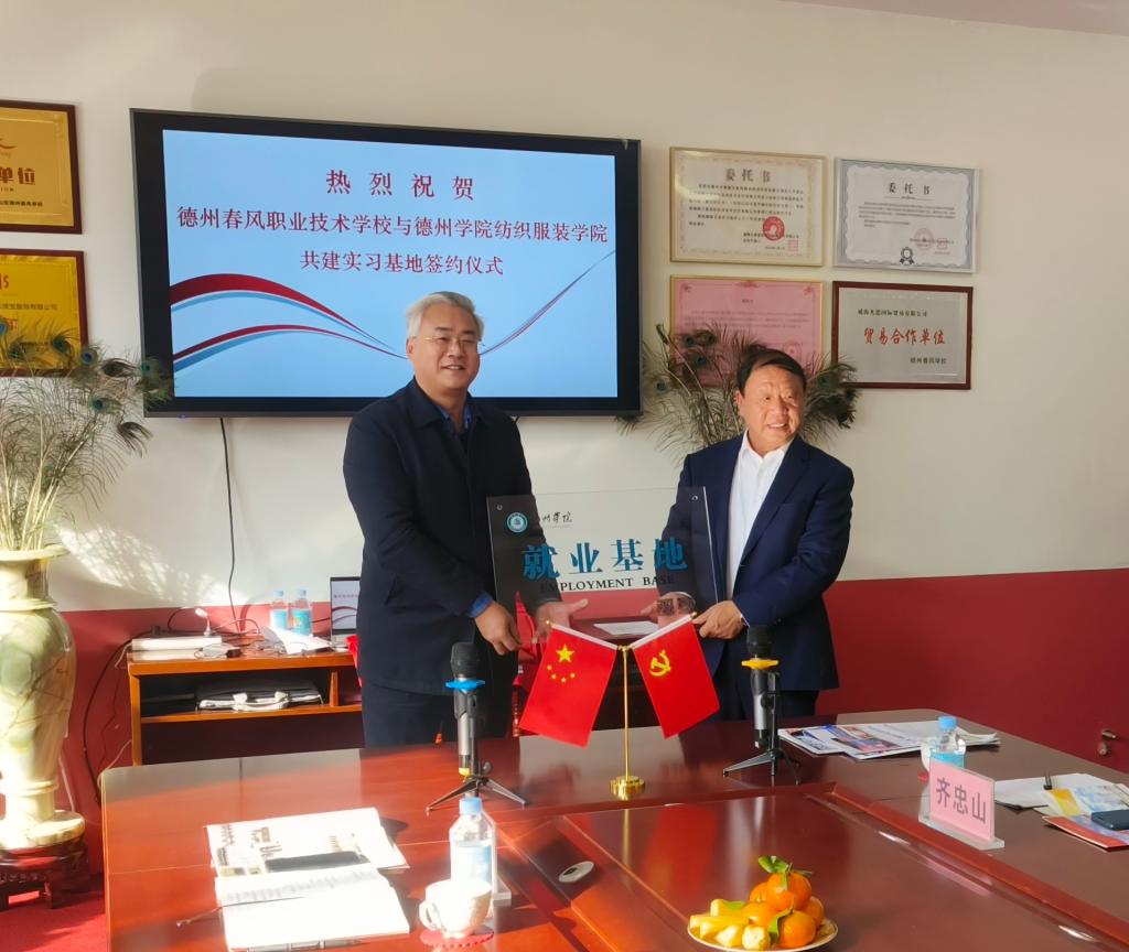 12月1日,亚博取款极速到账纺织服装学院与德州春风职业技术学校共建就业基地签约揭牌仪式在德州春风职业技术学校举行。德州春风职业技术学校校长齐忠山、德州商务发展中心主任李桂忠,亚博取款极速到账就业指导处、纺织服装学院负责人及相关教师和工作人员参加仪式。