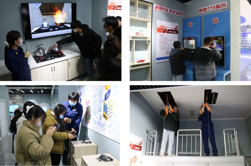 活动现场,讲解员通过实物展示、视频介绍、多媒体互动体验等科技手段,真实还原了客厅、厨房和电动车等火灾隐患场景,多角度讲解防火、灭火基本常识和消防器材使用方法等内容。在讲解员的指导下,学生依次体验了 119报警、安全绳逃生、模拟厨房灭火、地震逃生、电梯速降逃生,现场检验消防安全知识掌握程度。