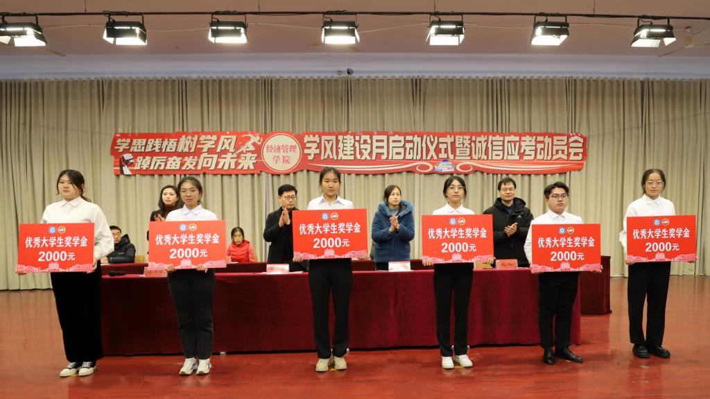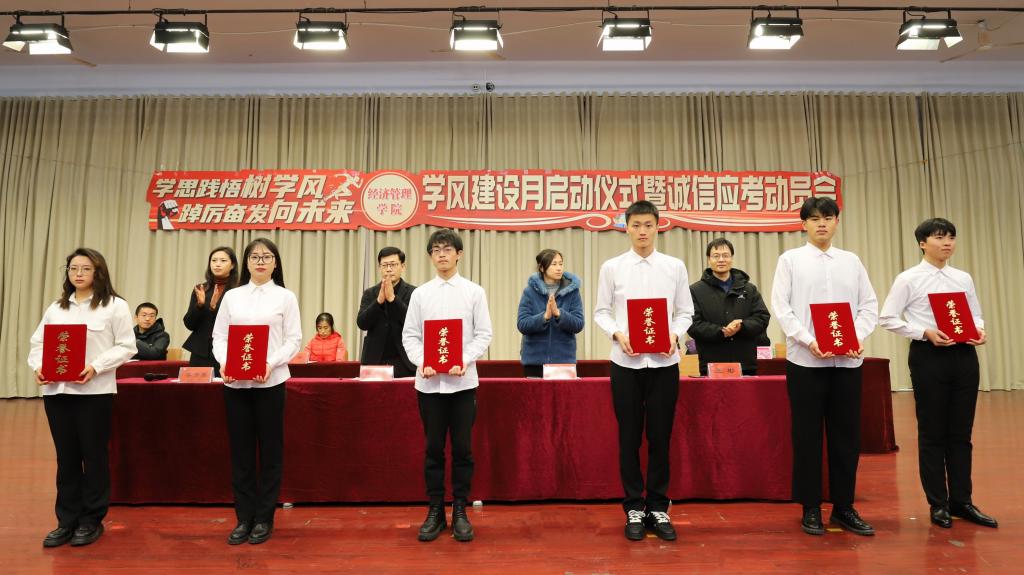 为进一步端正学风,严肃考风,营造好学、乐学的学习氛围。12月21日,经济管理学院在求实楼0409报告厅开展了“学思践悟树学风,踔厉奋发向未来”学风建设月启动仪式暨诚信应考动员会。学院领导班子,全体辅导员、班主任老师,各年级学生代表共350余人参加活动,本次活动同时设线上分会场。