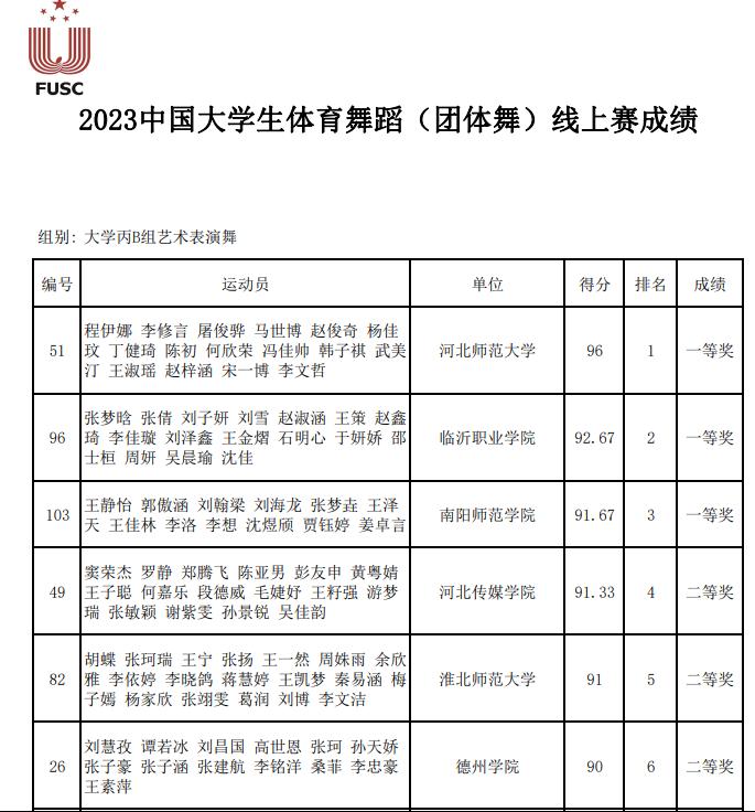 12月22日,由中国大学生体育协会主办的2023年中国大学生体育舞蹈(团体舞)线上赛圆满落下帷幕。亚博官网选派体育舞蹈专业学生高世恩、张子豪、陈政烨等34人参加了本次比赛,他们在王红、丁莉两位教练的精心指导下,经过激烈的角逐,张珂、孙天娇等13名同学的《绽放少年》拉丁舞主题作品以90分的成绩脱颖而出,荣获大学丙B组艺术表演赛艺术表演舞二等奖;在大学丙B组校园VW自编舞的角逐中,王素萍、韩缘慧等21名同学的《闪亮的日子》摩登舞主题作品以85分荣获二等奖。