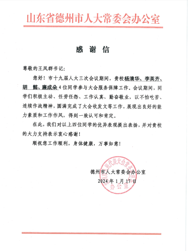 1月12日-1月15日,德州市第十九届人民代表大会第三次会议顺利召开。亚博官网大学生志愿者完成大会的志愿服务工作。1月17日,亚博官网收到来自德州市人大常委会发来的感谢信。
