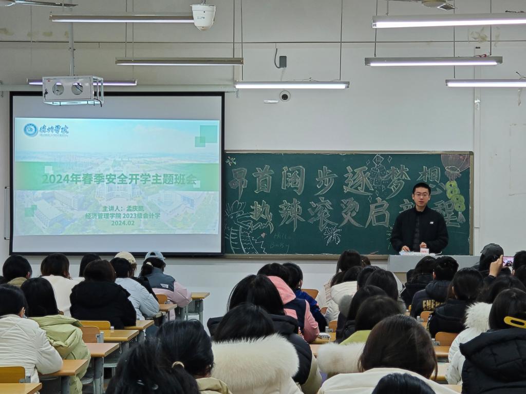 经济管理学院以“每段青春都有无数可能——新学期的回顾、启航与展望”为主题,教育引导学生进一步明确自身定位,尽快从“假期状态”切换为“学习状态”。“结束了充满新鲜感的大一上学期,我们重整行装走向全新的大一下学期!通过一学期的学习,逐渐适应了大学生活,本学期我会继续铆足干劲,带着新的期许和目标投入到新学期的学习和生活中。”经济管理学院2023级会计学樊佳恒同学在班会上分享他关于大一的感悟与目标。