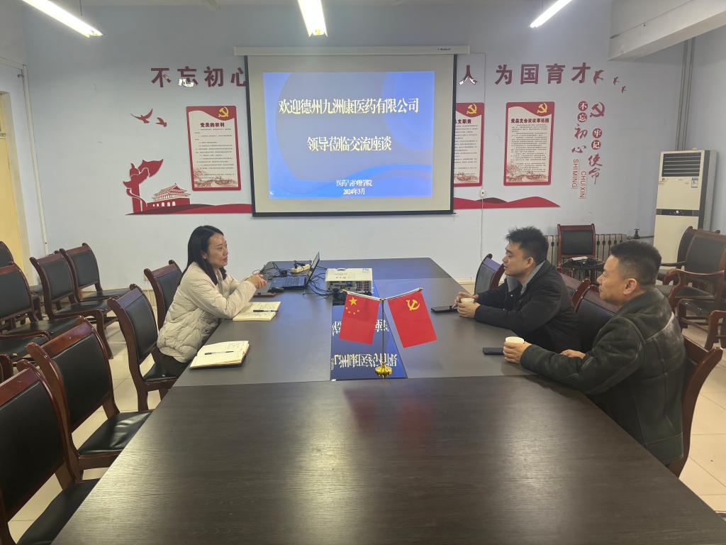 会议开始,学院相关负责人对学院专业和毕业生去向做了详细介绍。希望同企业加强联系,在就业基地、实习实践、创业服务、学生培养等方面开展合作。德州九洲康医药有限公司负责人对学院的发展作出了高度评价,双方就校企之间学生就业、招生计划、校企合作等方面的问题进行了深入的探讨与交流。最后,双方领导表示,希望通过此次交流,能够继续推动校企双方在医药领域的共勉,进一步促进学生就业工作的快速发展,同时,充分发挥双方优势,共同提高学生培养质量,推动构建校企协同育人生态。