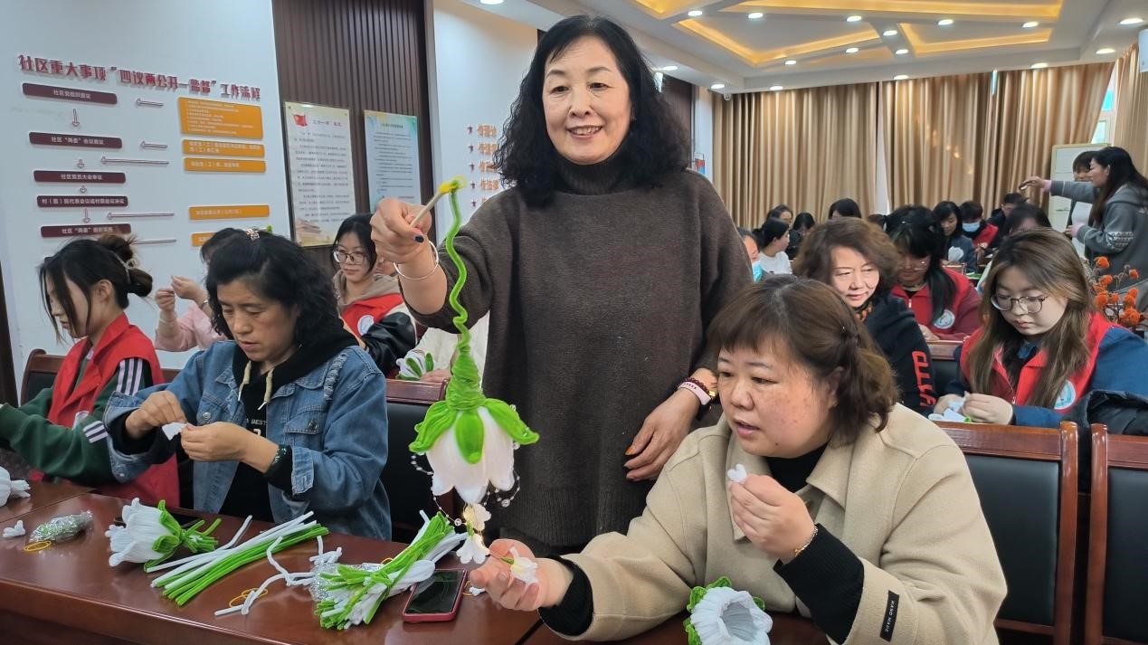 本次活动分为“手工花灯”的制作和网络直播平台的使用教学两个环节。纺织服装学院志愿者向社区居民们分发了此次活动中所用到的材料,为大家介绍了本次活动的相关事项,并对活动中扭扭棒制作花灯的具体步骤进行了详细的说明。在志愿者们的示范和指导下,居民们纷纷发挥自己的想象力,将不同颜色的扭扭棒进行搭配和编织,一个个精美的铃兰花灯和柿子花灯便制作完成。