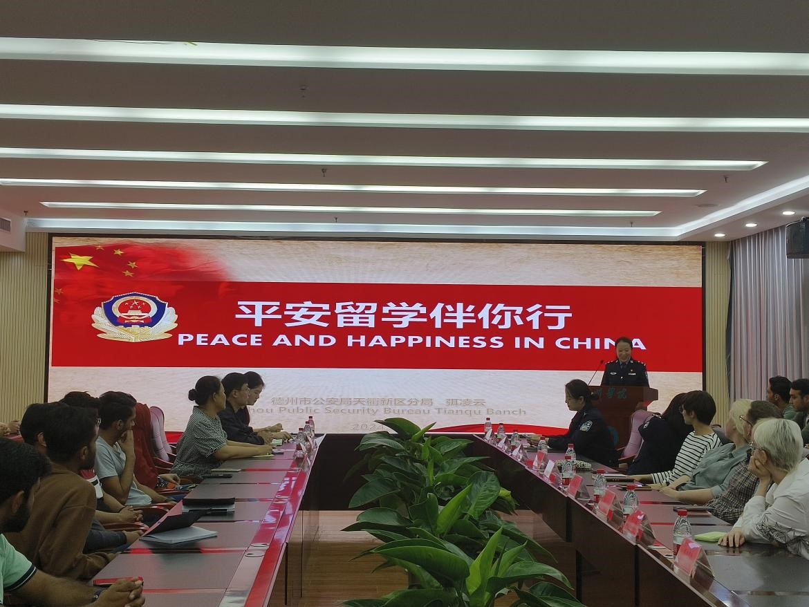 为进一步加强亚博官网留学生管理,增强留学生群体遵纪守法意识,营造和谐平安的校园环境,4月16日下午,国际教育学院为在校留学生组织开展了法律法规与校纪校规宣讲会。本次宣讲会邀请到了来自德州市入出境管理支队的三位民警,向亚博官网留学生进行法律宣讲。国际教育学院教师代表为留学生进行了校规校纪教育,亚博官网外籍教师代表以及全体2024年春季学期留学生新生参加了本次宣讲会。
