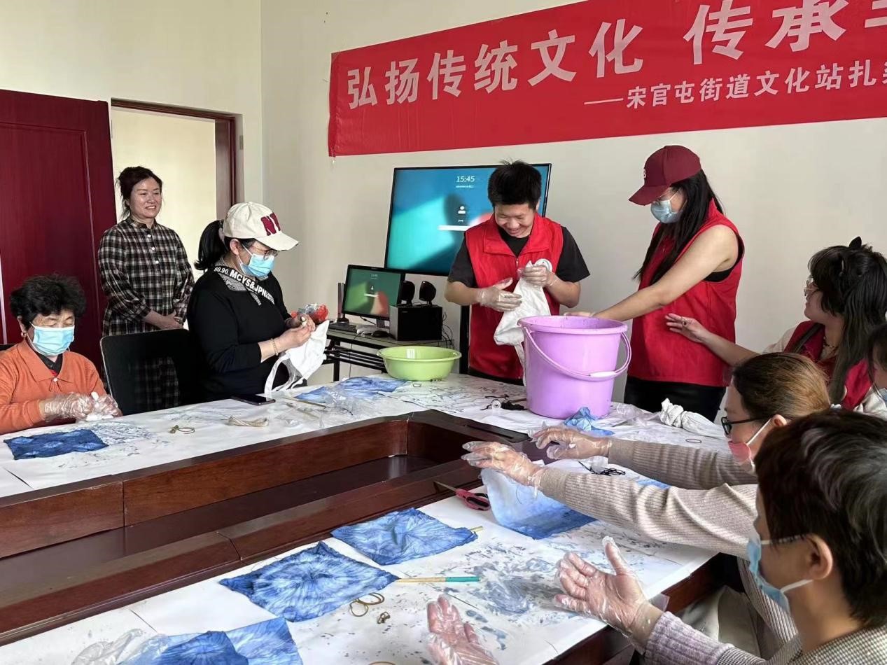 活动开始前,志愿者向参与活动的社区居民们介绍了有关扎染的历史、扎染种类及扎染原理,并为大家详细讲解了扎染的制作步骤、捆扎手法以及制作注意事项等知识。在志愿者的示范和指导下,社区居民们用充分发挥想象力和创造力,将布料运用的不同方式进行折叠、缠绕、卷曲,然后在染液的浸润下染色,创作出形态各异、色彩斑斓的扎染作品。制作完成后,大家纷纷展示自己的作品,分享制作心得,并表示在活动中不仅感受到传统扎染艺术的魅力,也缓解了工作生活压力,现场气氛热烈而和谐。