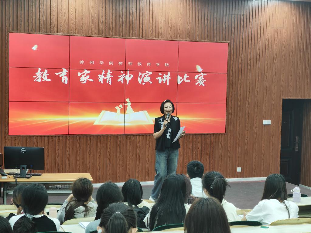活动过程中,各位参赛同学依次上台进行演讲,由德州市朗诵协会成员、国学经典诵读任课教师刘敏老师,教师教育学院党委副书记、辅导员担任评委。在同学们演讲完毕后,党委副书记强调了学习教育家精神对师范专业大学生的重要性,要求与会同学以教育家精神为指引,立志作一名好老师,大学期间积极准备和锻炼自己,不断提升自身的思想道德修养和专业能力。刘敏老师在点评同学的同时强调了演讲比赛中的技巧与策略,还指出同学们在演讲比赛过程中的不足,最后刘敏老师还现场朗诵《青春》片段进行展示。