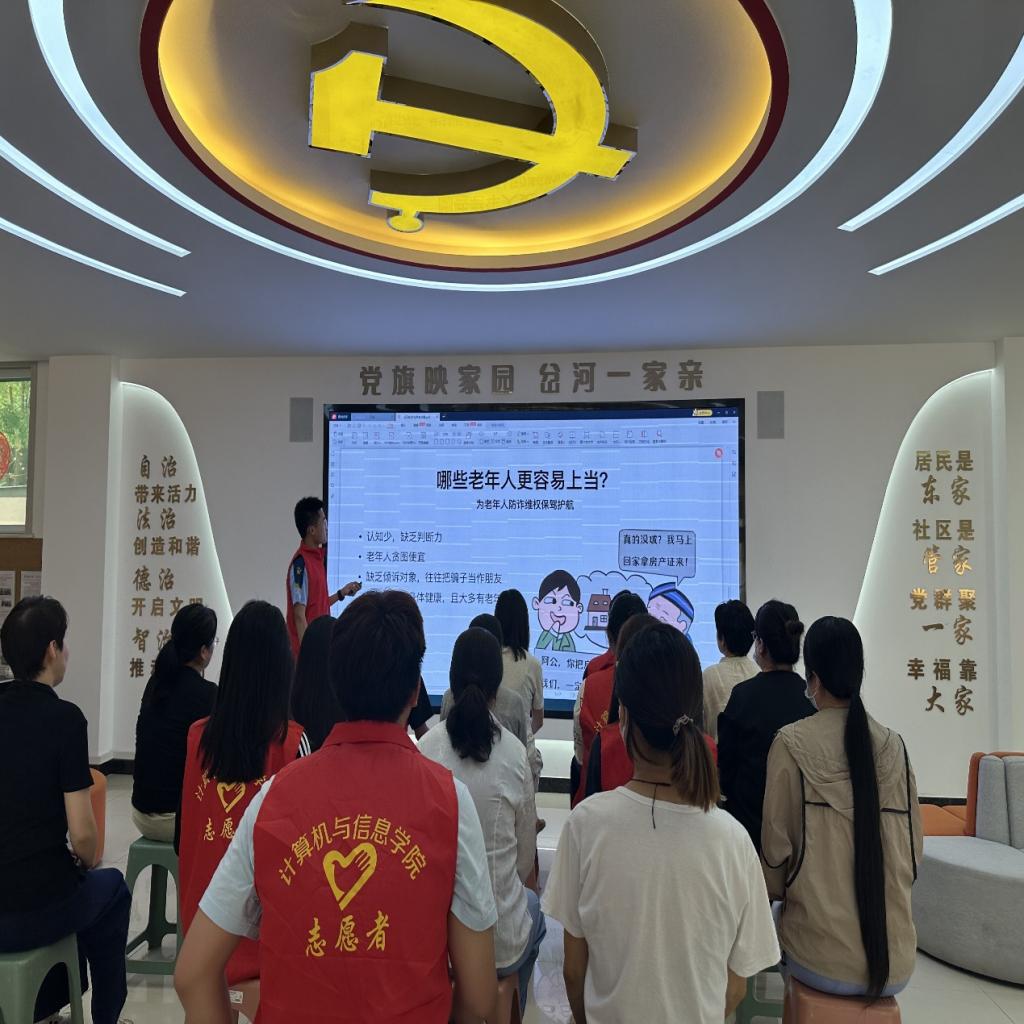 为进一步提升社区老年人的识骗、防骗能力,营造打击整治养老诈骗、电信网络诈骗的良好社会氛围。5月21日,计算机与信息学院软件工程(智能开发)2023级三四班团支部赴岔河社区举办“智慧识破,安全无忧”志愿活动。