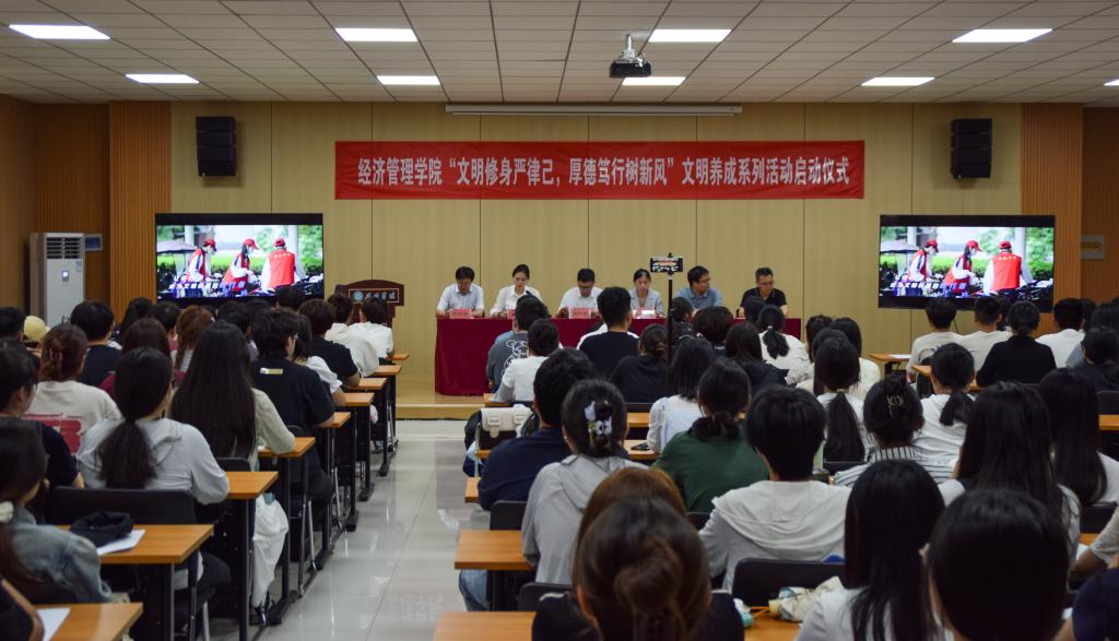 为进一步培育和践行社会主义核心价值观,引导学生养成良好的文明礼仪和行为习惯。5月28日,经济管理学院开展了“文明修身严律己,厚德笃行树新风”文明养成系列活动启动仪式。本次活动在明理楼157主会场和153视频分会场同步进行,经济管理学院班子成员、全体辅导员、非毕业班级全体班干部、学生社区服务中心成员共310余人参加。