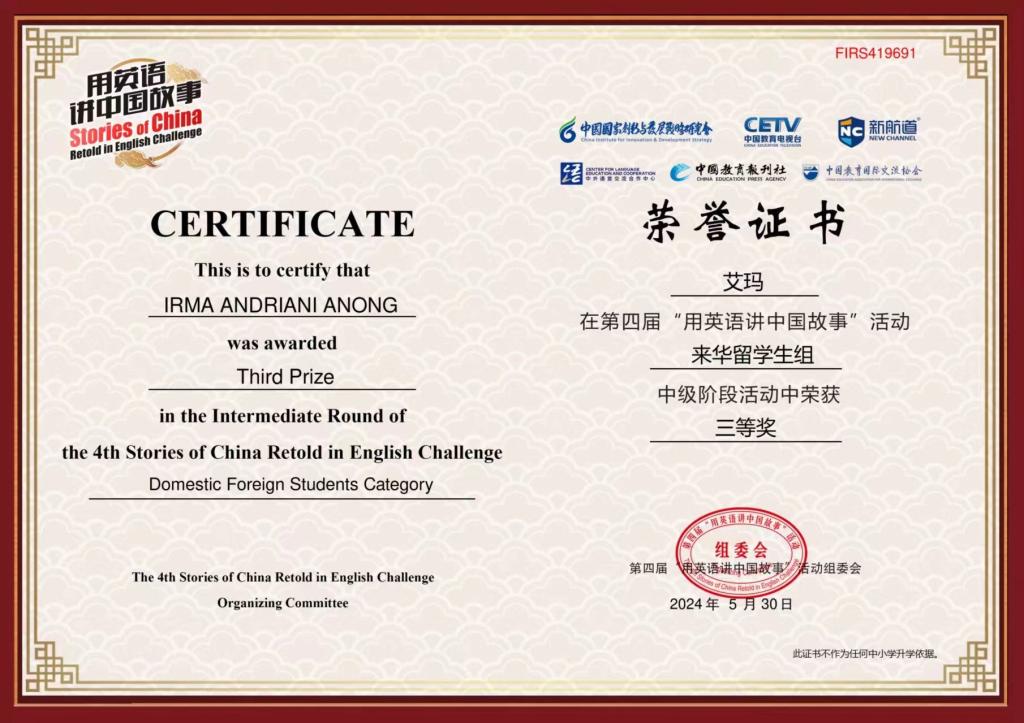 近日,亚博官网巴基斯坦籍留学生Chaudhry Haroon Haider Hayat刘升、印度尼西亚籍留学生Irma Andriani Anong艾玛在第四届“用英语讲中国故事”活动“来华留学生组”中级阶段活动中荣获三等奖。凭借自己在华学习期间的所见所闻,刘升生动讲述了中国的技术如何让自己国家的朋友惊叹不已,艾玛则形象地表达了对陕西特色面食文化的喜爱。两位留学生凭借出色的表现,在激烈角逐中脱颖而出。