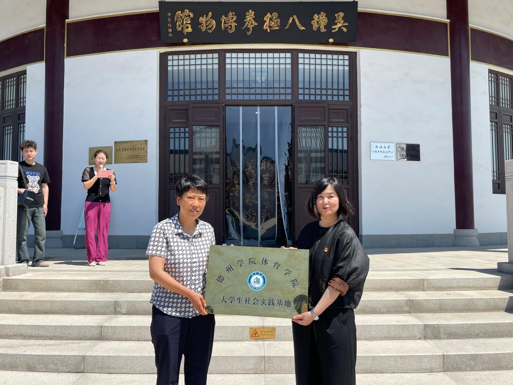 在吴钟八极拳博物馆,工作人员详细介绍了馆中收藏的珍贵文物资料,讲述了吴钟八极拳在中华武术史上发挥的重要价值意义。学院师生代表进行了精彩的八极拳展示,与吴钟八极拳传承人、爱好者切磋技艺。双方领导为大学生社会实践基地揭牌,并向吴钟八极拳技艺传承老师颁发“校外指导教师”聘书。