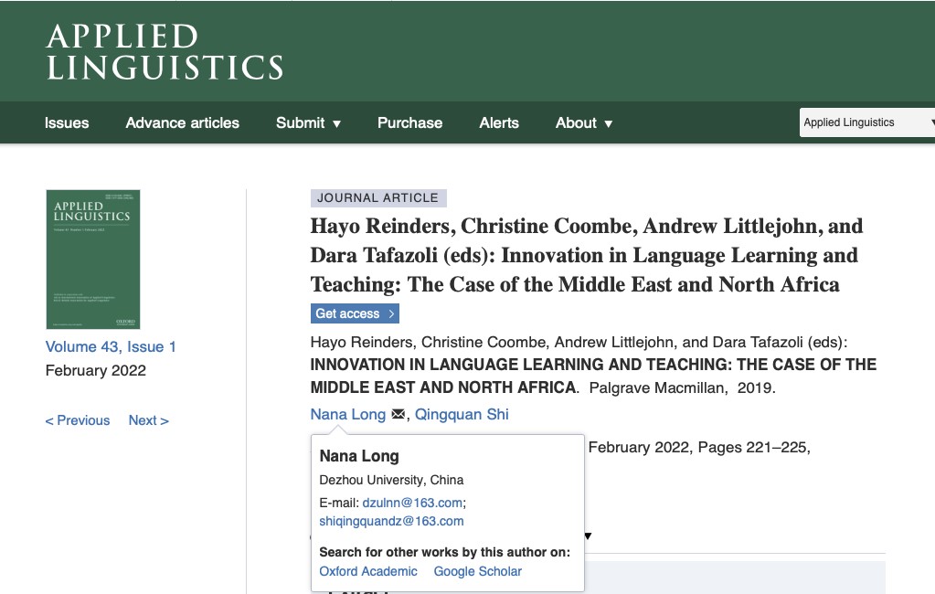 近日,外国语学院在《Applied Linguistics》发表了题目为“Innovation in Language Learning and Teaching”的文章,龙娜娜博士为第一作者。Applied Linguistics(5年影响因子6.178)是中科院语言学SSCI一区TOP期刊,由牛津大学出版社出版。