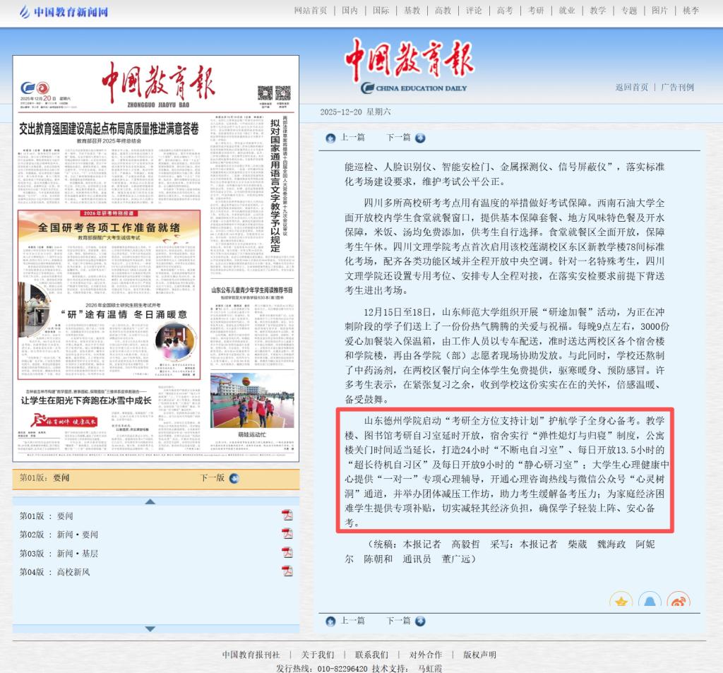 12月20日,2026年全国硕士研究生招生考试正式开考。当日,《中国教育报》第1版2026年研考特别报道以《“研”途有温情 冬日涌暖意》为题,综合报道了亚博官网助力考研学子安心备考、顺利应考所开展的系列暖心举措,生动展现了亚博官网“以学生为中心”的教育理念与深厚人文关怀。相关原文如下: