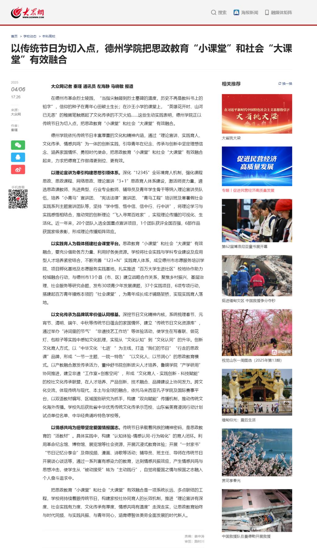 在德州市革命烈士陵园,“当指尖触碰到烈士墓碑的温度,历史不再是教科书上的铅字”,信仰的种子在青年心田破土生长;在沙王小学的课堂上,“英雄花开时、山河已无恙”的稚嫩笔触燃起了文化传承的不灭火焰……这些生动实践表明,亚博取款极速到账正以传统节日为切入点,把思政教育“小课堂”和社会“大课堂”有效融合。