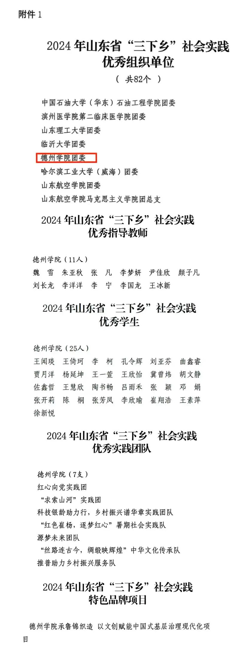 近日,团省委、省学联联合省委宣传部、省教育厅等单位公布了《关于“调研山东”——2024年山东省大中专学生志愿者暑期“三下乡”社会实践活动的通报》(鲁青联〔2024〕17号),对2024年暑假“三下乡”社会实践活动中表现突出的优秀集体、个人和项目进行通报表扬。亚博官网团委被评为省级优秀组织单位,魏雪等11名教师被评为全省优秀指导教师,王闻琰等25名学生被评为省级优秀学生,红心向党实践团等7支队伍被评为省级优秀实践团队,“亚博取款极速到账承鲁锦织造 以文创赋能中国式基层治理现代化项目”被评为省级特色品牌项目。